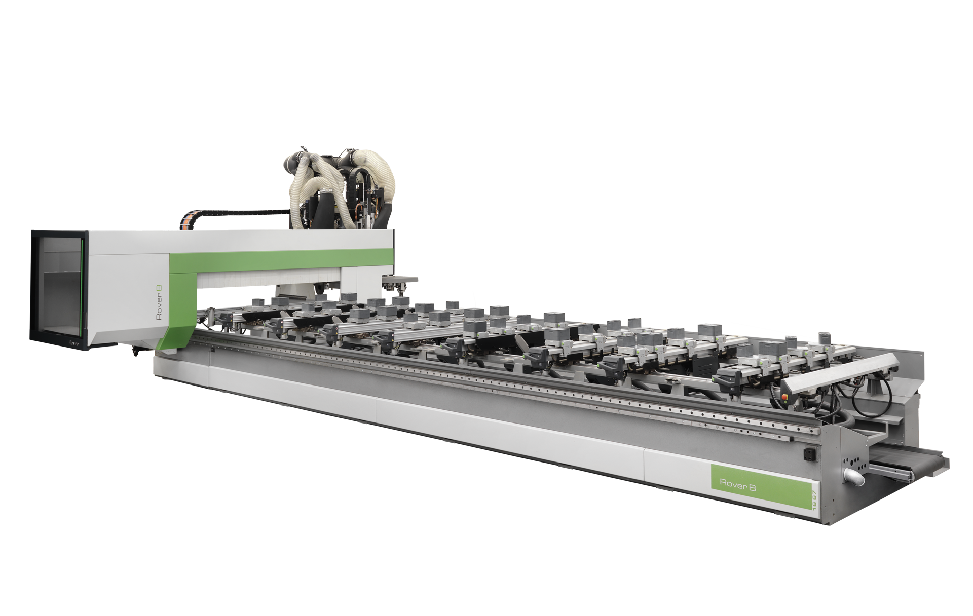 CNC BIESSE ROVER B 5 ASSI: Dimensione piano di lavoro 6400 x 2200 mm; Passaggio pezzo 250 mm; Carico/scarico tramite manipolatore con ventose