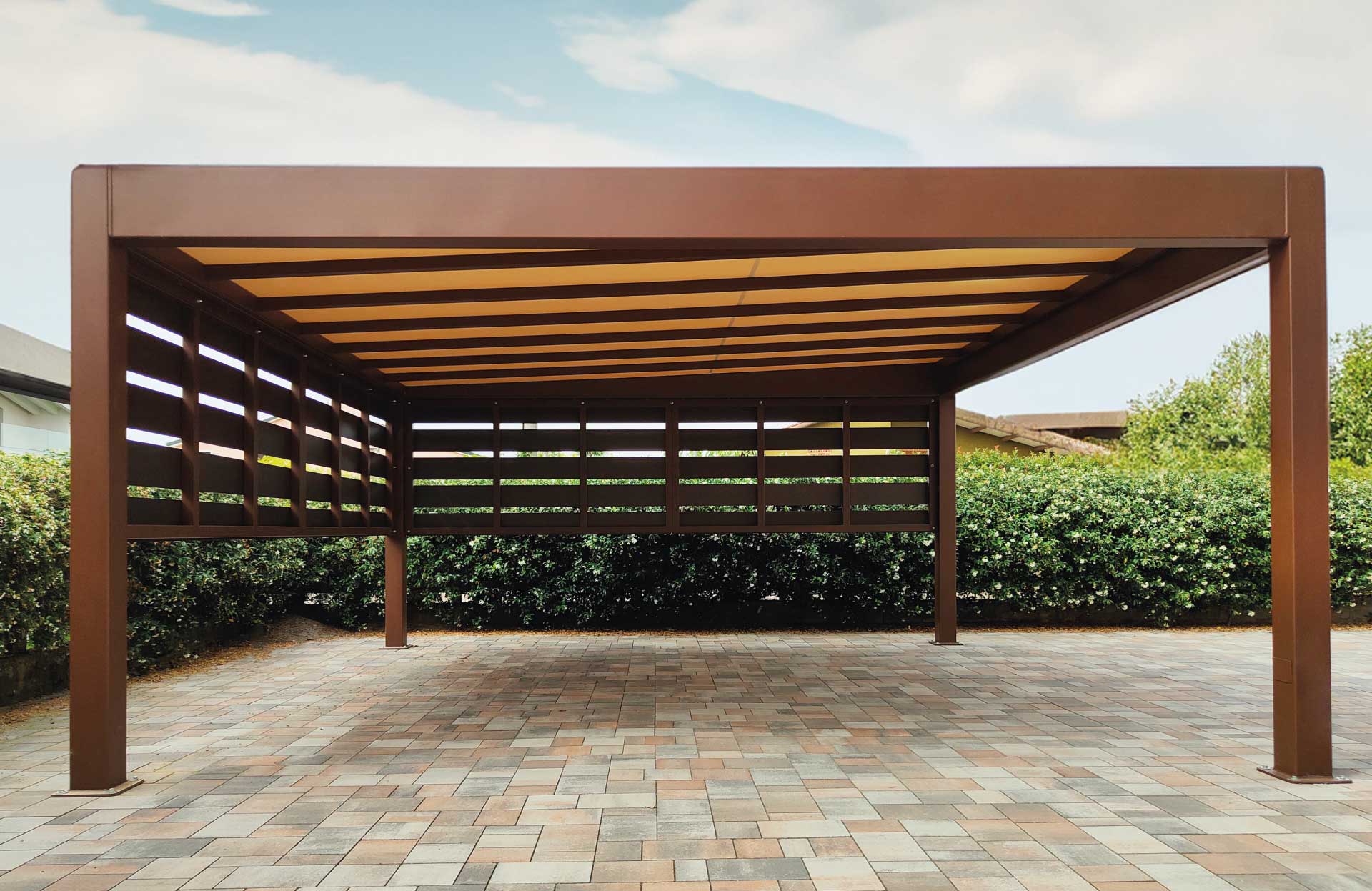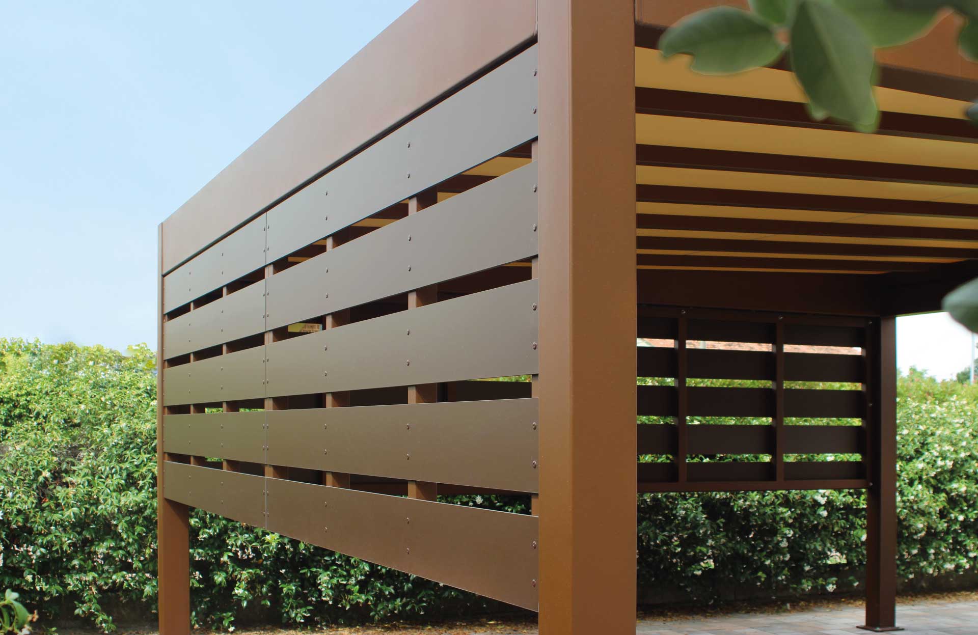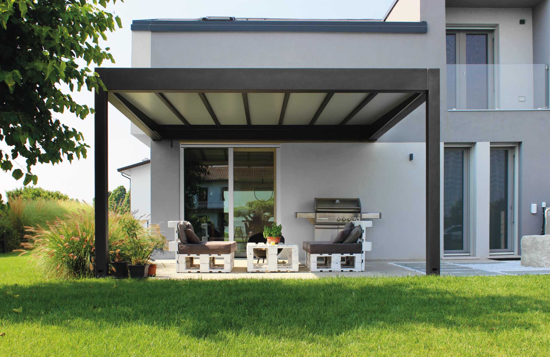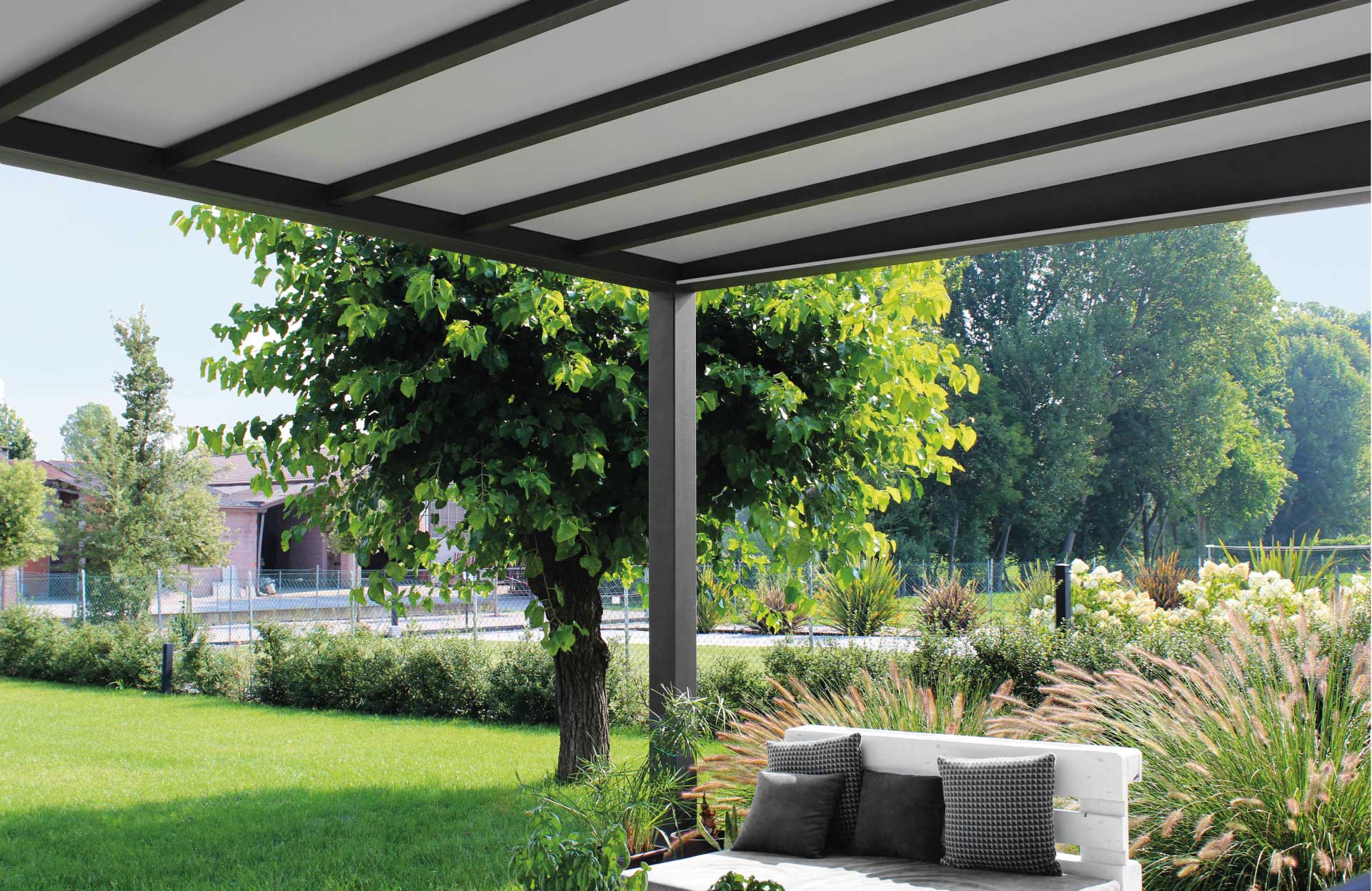 Le tettoie prodotte dal Gruppo GB consentono di creare spazi all’aperto in grado di assicurare il massimo confort grazie all’efficace protezione dal sole e dalle intemperie.